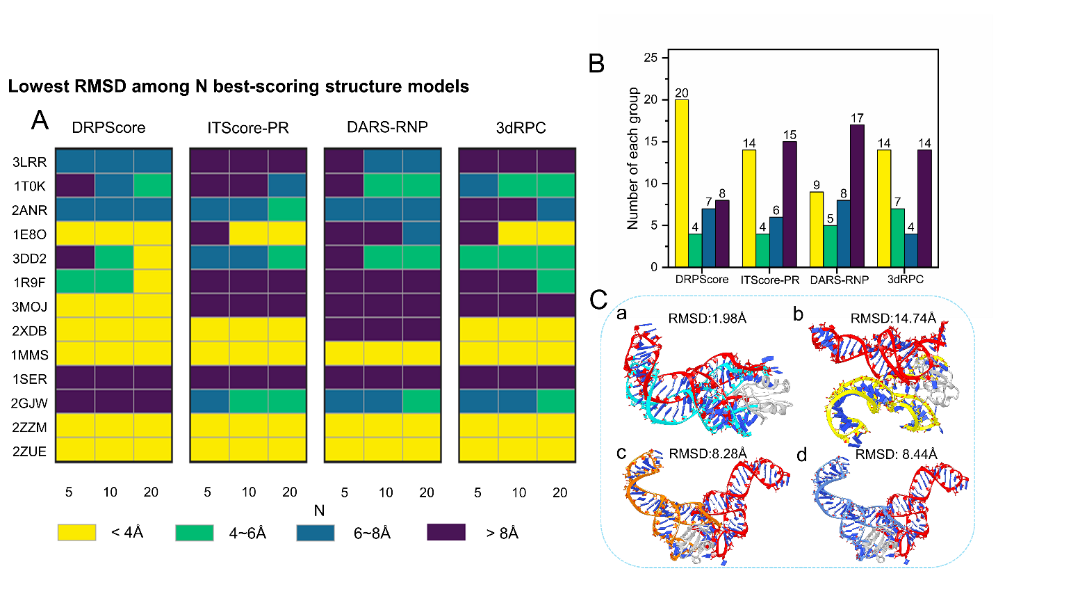 圖2. 柔性對接測試集結果。黃色為近天然態結構,DRPScore的預測精度顯著高于傳統模型
