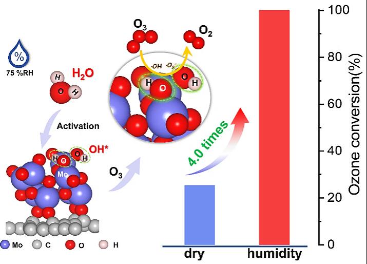 高濕度環境下臭氧在氧化鉬/石墨炔納米墻分解機制研究示意圖