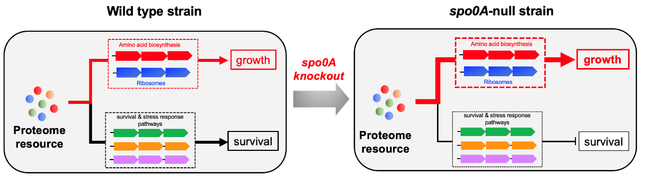 戴雄風(fēng)團(tuán)隊(duì)采用生理生化手段與高通量組學(xué)技術(shù),發(fā)現(xiàn)枯草芽孢桿菌的資源配置策略并不是單一性地追求生長速率最大化,而是在生長與存活之間保持平衡。該研究發(fā)現(xiàn)Spo0A蛋白是枯草芽孢桿菌生長與存活的全局調(diào)控因子(圖1),如果該基因缺失,芽孢桿菌的生長繁殖能力與長期存活能力出現(xiàn)此消彼長的現(xiàn)象(Trade-off);生長速率顯著提高,但長期存活能力會(huì)顯著降低,長期來看對(duì)細(xì)菌種群的適合度是不利的。