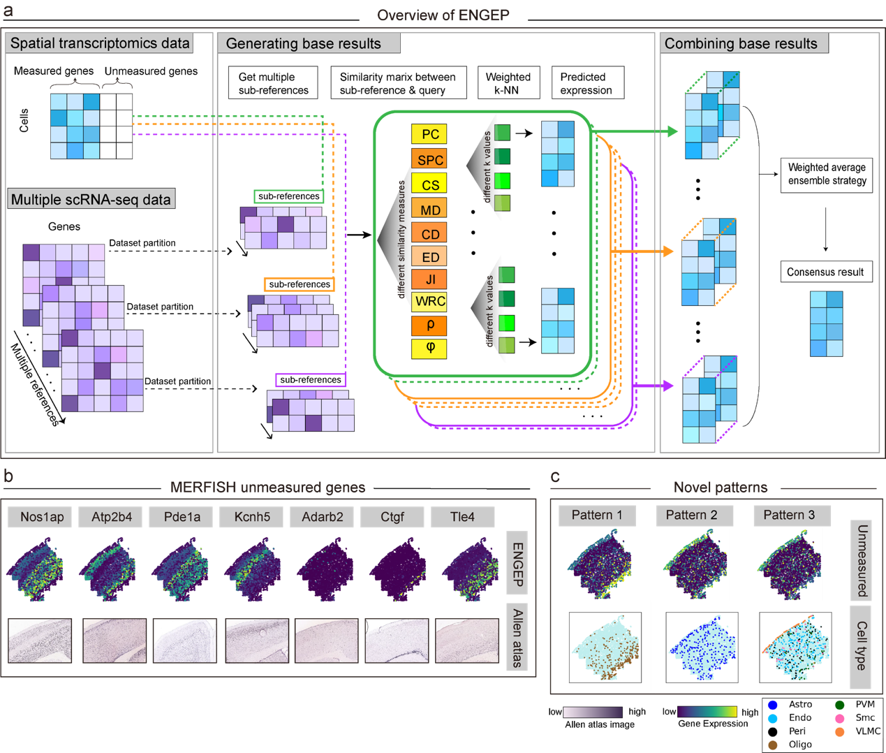 圖為ENGEP增強空間轉錄組學數據。a:ENGEP算法工作流程。b: ENGEP準確預測空間未測基因的表達模式。c:ENGEP揭示新的空間表達模式。ISH圖片來自Allen Mouse Brain Atlas (http://mouse.brain-map.org/)