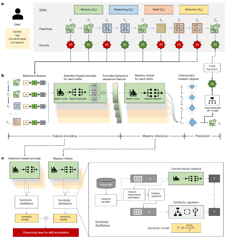 認知技能習得是教育科學與認知科學研究中一個重要的領域,掌握技能習得規律可以幫助人們更科學、更高效地學習知識和技能。然而,技能習得涉及多個復雜的認知心理過程,傳統實驗范式揭示的規律往往存在爭議且缺乏普適性。該研究采用AI4Science范式,通過設計新穎的智能算法,自動從自然發生的大規模日志數據中挖掘內蘊的技能習得規律。文章針對學習狀態內隱、算子搜索組合爆炸等問題,設計了一個兩階段的規律挖掘算法。首先,利用自回歸的方式訓練深度學習模型,實現學習狀態計算與特征重要性評估。其次,提出一種符號化蒸餾的方法將神經網絡模型解析為代數方程式,實現學習規律的顯式表達。