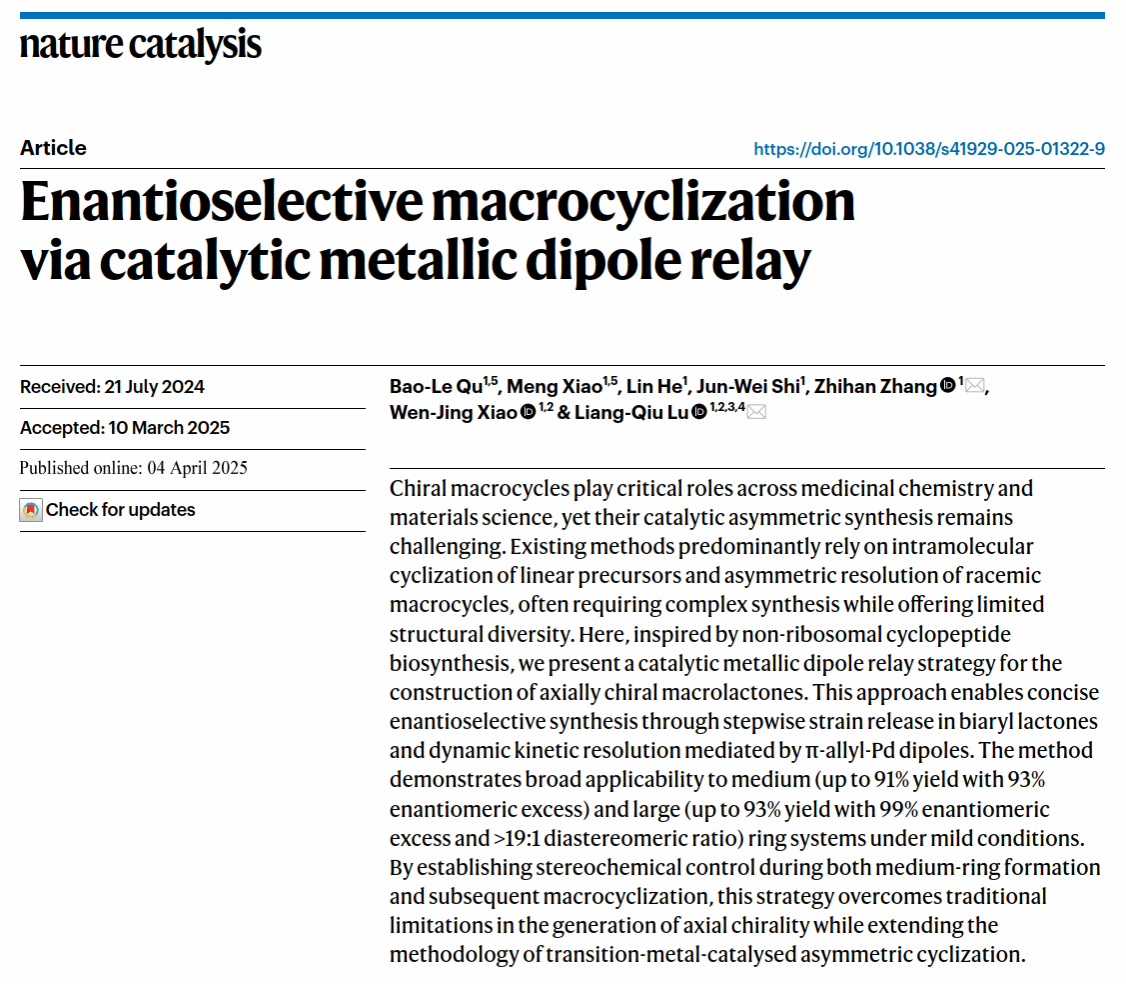 華大在線訊(通訊員 周漢鳴)4月4日,我校化學學院肖文精教授團隊在國際頂級期刊《自然催化》(Nature Catalysis)發(fā)表題為"催化的金屬偶極體接力實現(xiàn)對映選擇性大環(huán)化"(Enantioselective macrocyclization via catalytic metallic dipole relay)的研究論文。該研究創(chuàng)新性地提出了"金屬偶極體接力"策略,為軸手性大環(huán)化合物的高效合成開辟了新路徑。華中師范大學博士研究生曲寶樂(實驗研究)和肖萌(理論計算)為共同第一作者,陸良秋教授和張之涵教授為共同通訊作者,我校為第一完成單位。