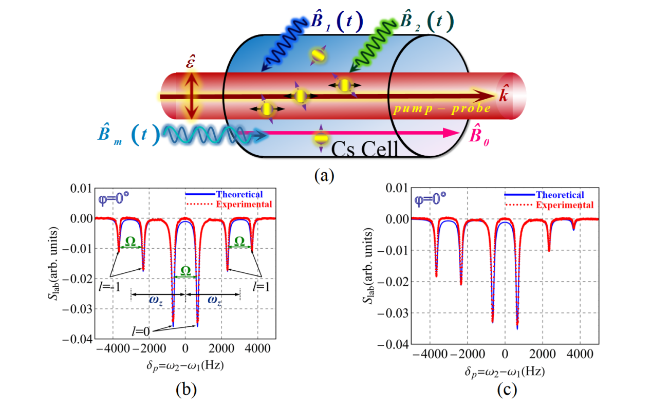 針對這一問題,該研究團(tuán)隊提出了弗洛凱調(diào)制角動量為J(J≥1)的多能級熱原子磁共振系統(tǒng)高階極化矩廣義宇稱理論,研究了具有廣義宇稱的張量極化矩(alignment)的性質(zhì),揭示了廣義宇稱保護(hù)高階極化矩光譜對稱性的物理規(guī)律。在此基礎(chǔ)上,他們巧妙設(shè)計并開展了基于張量極化的周期性驅(qū)動激光泵浦-探測銫原子磁共振、從頻域直接驗證廣義宇稱保護(hù)張量極化光譜對稱性理論的實(shí)驗(如圖1所示)。相關(guān)研究結(jié)果不僅豐富了弗洛凱驅(qū)動多能級量子系統(tǒng)高階極化矩廣義宇稱理論和實(shí)驗,還對設(shè)計基于高階極化矩的高靈敏矢量原子磁力儀起著促進(jìn)作用。