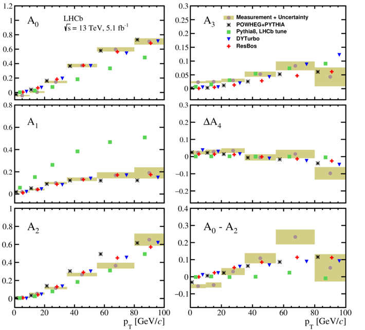 由物理學院謝躍紅教授、尹航教授和張冬亮副教授等組成的LHCb研究團隊近年來在重味物理和強子譜學的研究中取得了多項重要成果,包括Bs介子混合角的世界最精確測量和雙粲重子的發現,在電弱物理方面也有長期積累。在此次的研究中,課題組分析了LHCb實驗在13TeV質子-質子對撞能量下獲取的大量數據,解決了探測器刻度、本底分析和效率修正等方面的一系列難題,精確測量了Z玻色子的極化參數(圖1)。同時對前向區域Z玻色子的產生截面進行了迄今為止最精確的測量。這些研究成果可以幫助我們檢驗標準模型的一些重要理論預言,并為理解質子內部結構提供重要信息,特別是關于??淇艘约瓣P于橫動量相關的部分子分布函數的信息。經LHCb國際合作組遴選推薦,今年3-4月份《歐洲核子研究中心信報》(CERNCourier)報道了這兩項最新研究成果。