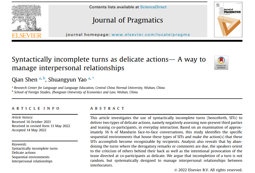 華大在線訊(通訊員 龔睿)近日,語言與語言教育研究中心姚雙云教授及其團隊在漢語口語語法研究中取得新的進展,在語用學國際知名期刊Journal of Pragmatics第197期上發表題為“Syntactically incomplete turns as delicate actions— A way to manage interpersonal relationships”的研究論文。該文為我校博士生沈謙和導師姚雙云教授合作發表,是國家社科基金重點項目的階段性成果,也是該團隊第二次在該刊物發表重要成果。