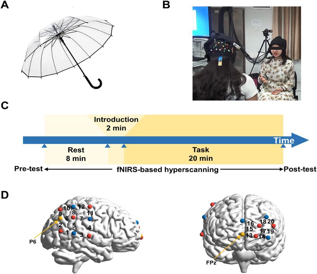 基于長期以來在創(chuàng)造力與認知神經(jīng)方面的工作基礎(chǔ),趙慶柏教授課題組采用基于功能性近紅外光譜成像儀(fNIRS)的超掃描(hyperscanning)技術(shù),從多腦功能整合的視角探究自然交流情境下團體創(chuàng)造任務(wù)的獨特神經(jīng)模式。通過衡量創(chuàng)造性任務(wù)與非創(chuàng)造性任務(wù)(一般任務(wù))的人際神經(jīng)同步(interpersonal neural synchronization, INS)差異來考察團體創(chuàng)造中小組成員的腦間神經(jīng)活動特點。