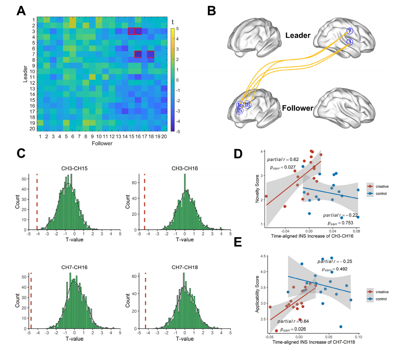 圖2:團體創(chuàng)造中思路引領(lǐng)者和追隨者的大腦間神經(jīng)同步及其與觀點創(chuàng)造性的關(guān)系