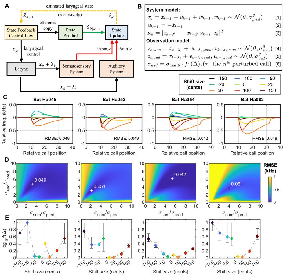 目前關于回聲定位蝙蝠發聲頻率調節的假說主要包括多普勒頻移補償(Doppler shift compensation)、干擾規避反應(Jamming avoidance response)和注意反應假說(Attention reaction hypothesis),但是這些現有的假說均不能完整地解釋本實驗的結果。隨后,研究人員將思路投向了人類言語的頻率調節假說——感覺誤差校準假說(Sensory error correction)。人類言語的頻率調節機制研究相對透徹,已經建立了高質量的數據計算模型。課題組經過不懈努力,成功將人類言語頻率調節的狀態反饋控制(Statefeedbackcontrol)模型應用到了大蹄蝠回聲定位聲波頻率調節上。在大蹄蝠上構建的狀態反饋控制模型不僅具有極高的精度(總體誤差僅為61Hz,約為大蹄蝠自然發聲頻率變異的四分之一),而且能解釋為什么同一只蝙蝠在不同聽覺反饋干擾條件下呈現出不同的發聲頻率調節行為,也能夠解釋同一條件下不同個體之間的顯著行為差異。