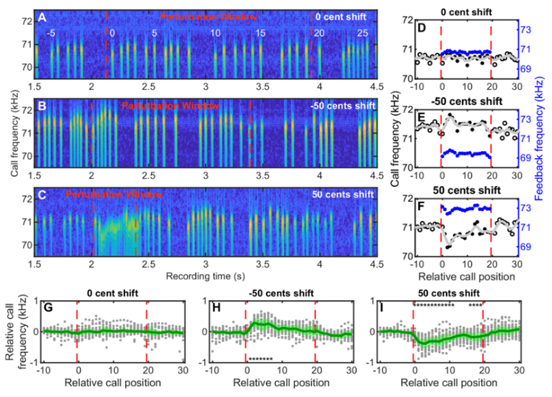 羅金紅教授課題組以大蹄蝠(Hipposideros armiger)為實驗對象,利用聽覺反饋干擾行為范式解析了大蹄蝠發聲頻率調節的計算機制。實驗人員基于FPGA(可編程邏輯門陣列)技術首次搭建了聲信號輸入–輸出時延低于千分之一秒的實時變頻聽覺反饋干擾平臺,從而可以在線調節大蹄蝠接收到的聽覺反饋信息。通過創造聽覺感覺誤差,研究人員發現大蹄蝠呈現出了快速的頻率補償行為——發聲頻率改變方向與干擾頻率(感覺誤差)方向相反。