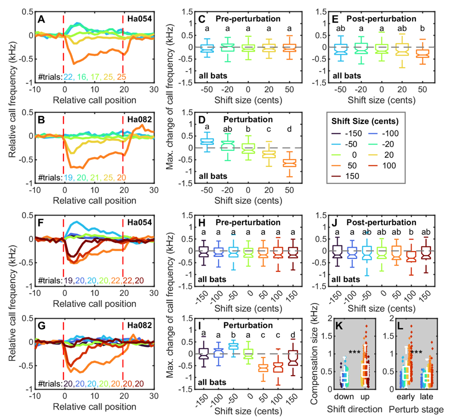 該研究進一步發現,干擾頻率(感覺誤差)的大小影響大蹄蝠頻率補償的大小,但是兩者并不是簡單的線性關系。其中在正向50音分的頻移下,大蹄蝠的頻率補償行為最為明顯。這可能是因為正向50音分對應的飛行速度與大蹄蝠在自然狀態下的飛行速度最接近,蝙蝠對此實驗條件感覺更真實。