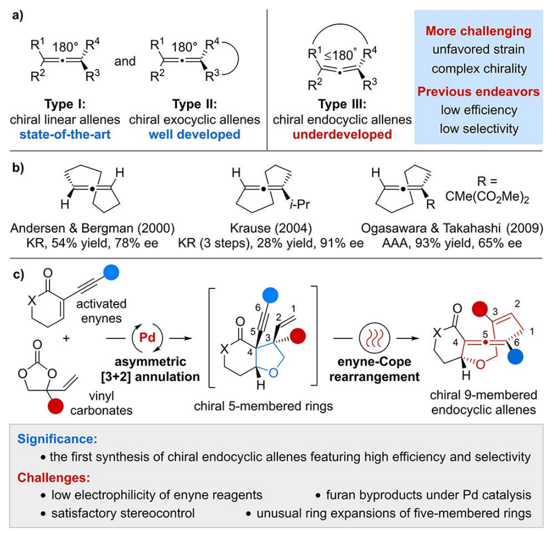 聯烯化合物由于其獨特的結構和性質,在合成化學、藥物化學和材料科學等領域有著非常廣泛的應用。因此,聯烯合成一直是現代合成化學的一個重要研究內容。近年來,隨著不對稱金屬催化和有機催化的快速發展,化學家們為手性聯烯的不對稱催化合成提供了許多有效的方法,但大多數集中于線性聯烯或1,2-環外聯烯的合成。手性1,3-環內聯烯的不對稱催化合成一直是該領域的一個重要挑戰,尤其是具有中環結構的環內聯烯由于其較大的環張力和復雜的手性環境(中心手性、聯烯軸手性)更具挑戰性,迫切需要發展新的策略用于這類中環骨架的高效、高選擇性合成。